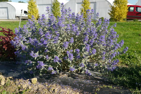 Caryopteris with an erected large shape, pale gray foliage and mauve clusters in July-August.