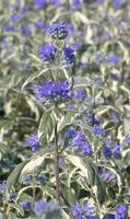 Caryopteris with an erected large shape, pale gray foliage margined with pure white, mauve clusters in July-August. Sport of 'Heavenly Blue'.